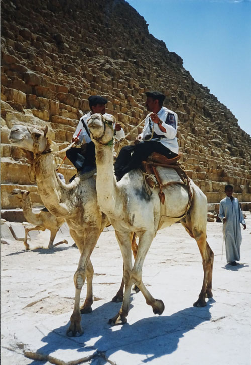 Kamelen op het Plateau van Giza voor de piramide van Cheops 4e dyn.